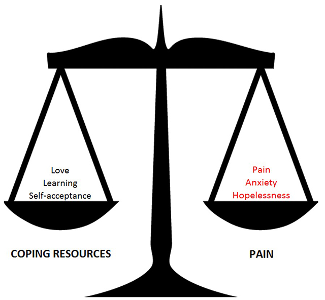So let’s look at it graphically… The scales below represent your emotional state. On the left hand side you have your coping resources and on the right hand side you have your pain.